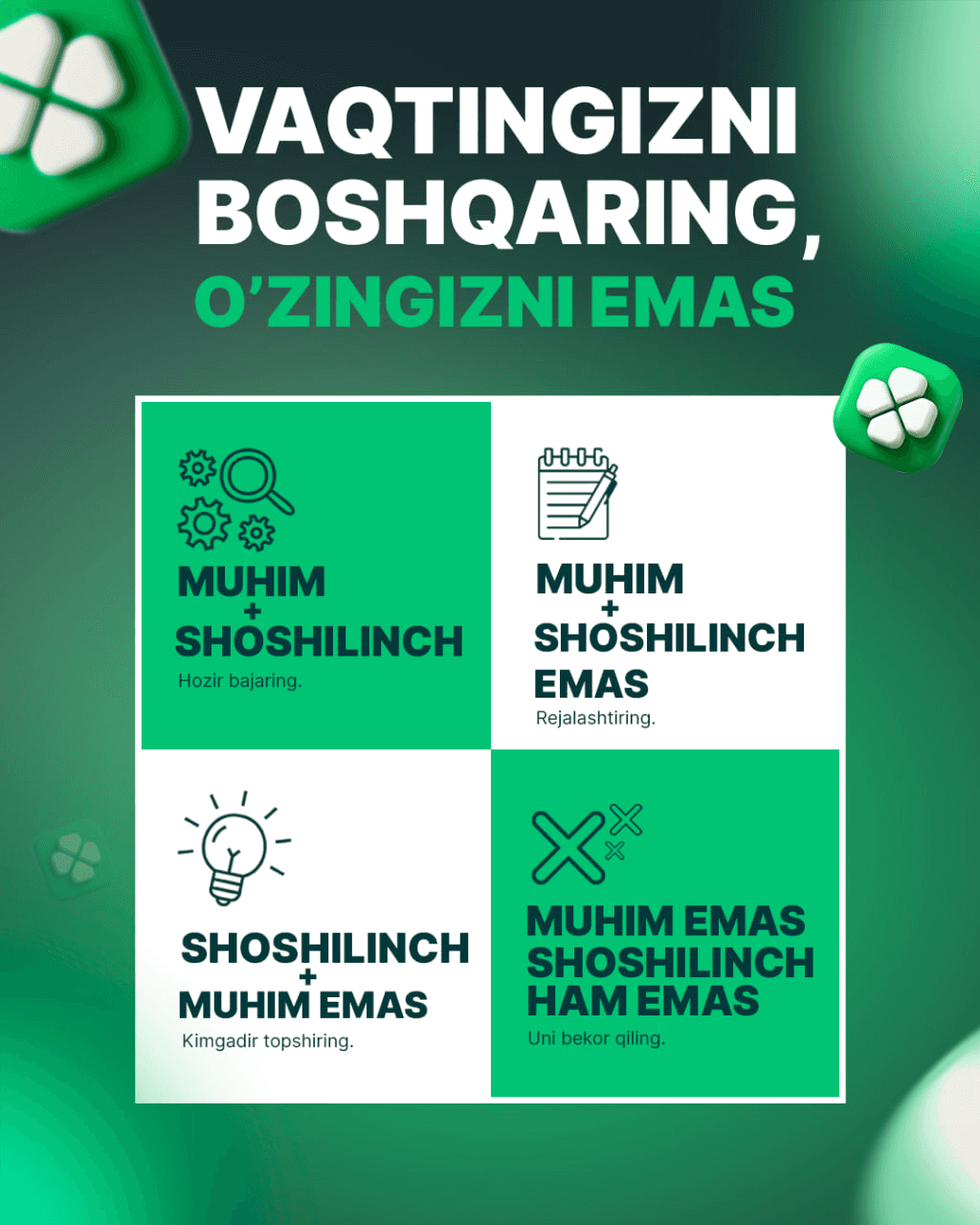 Shu 2 ta savol esa barchasini o'zgartiradi: "Bu ish muhimmi? Shoshilinchmi?"